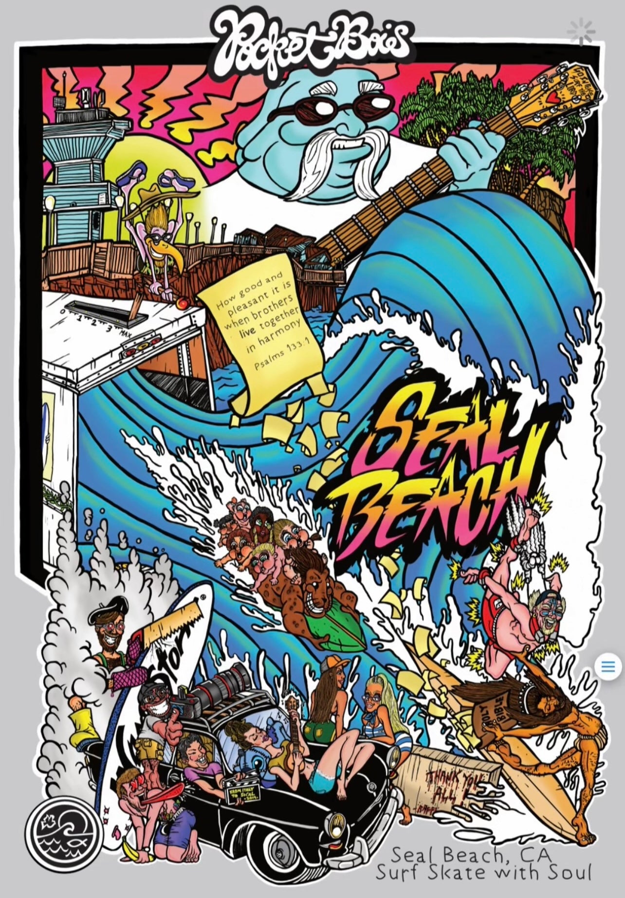 This design was hand drawn by #pbfam and artist Rafael Chiappani while he was down here visiting from North Italy. He gives homage to the late Pastor Chuck Carlson who he's never met, only heard of. He also highlights things like Mike senior with his balancing magnets and balancing sunscreen (if you know, you know). As you can see the design shows everyone getting along and having a good time. It's a community that Pocket Bois is proud to be a part of.